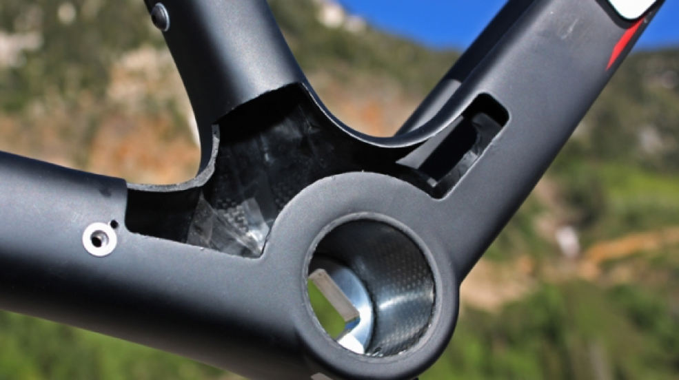 培林安裝在碳纖車架上的承座是跟著車架一起按模具成型的,這樣的好處是節省重量。車架五通寬度也膨脹到公路車的90mm,與登山車的95mm,創造出可觀的空間乘載更大管件與懸吊系統轉點。