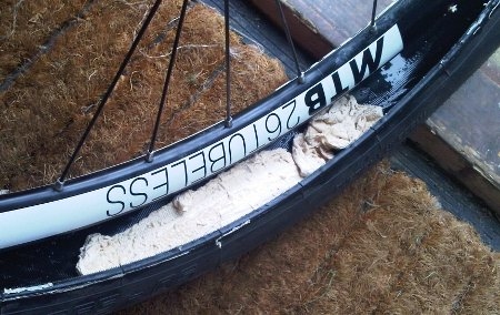 •把氣嘴轉置12點鐘的方向讓咖啡拿鐵補胎液堆積至輪胎底部,再使用CO2打氣瓶,讓咖啡拿鐵比較不會接觸極大的溫差。如果氣嘴處有咖啡拿鐵的泡沫,直接使用CO2打氣瓶不會有影響。