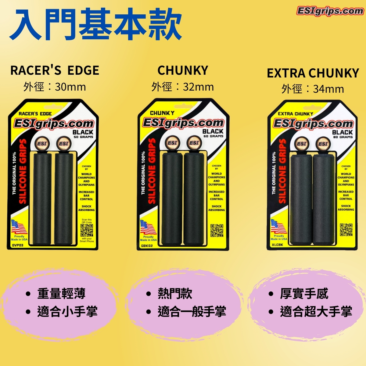 請記住,握把不是越大越好! 以下是從最薄到最厚的ESI握把尺寸指南,可幫助你選擇最適合需求的ESI型號: