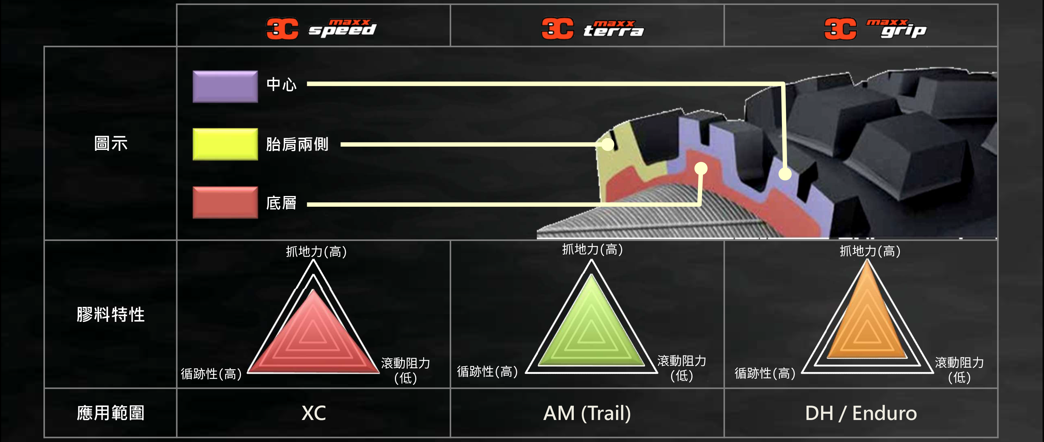MAXXIS有3種不同的膠料配方,簡單來說,追求速度(XC地形)的話,可以選擇3CS的膠料配方;追求最好的抓地力(DH或ENDURO地形)可以選擇3CG的膠料配方。3CT是綜合以上兩種特性,如果沒有特別的需求或想法,也可以先使用3CT的外胎。
