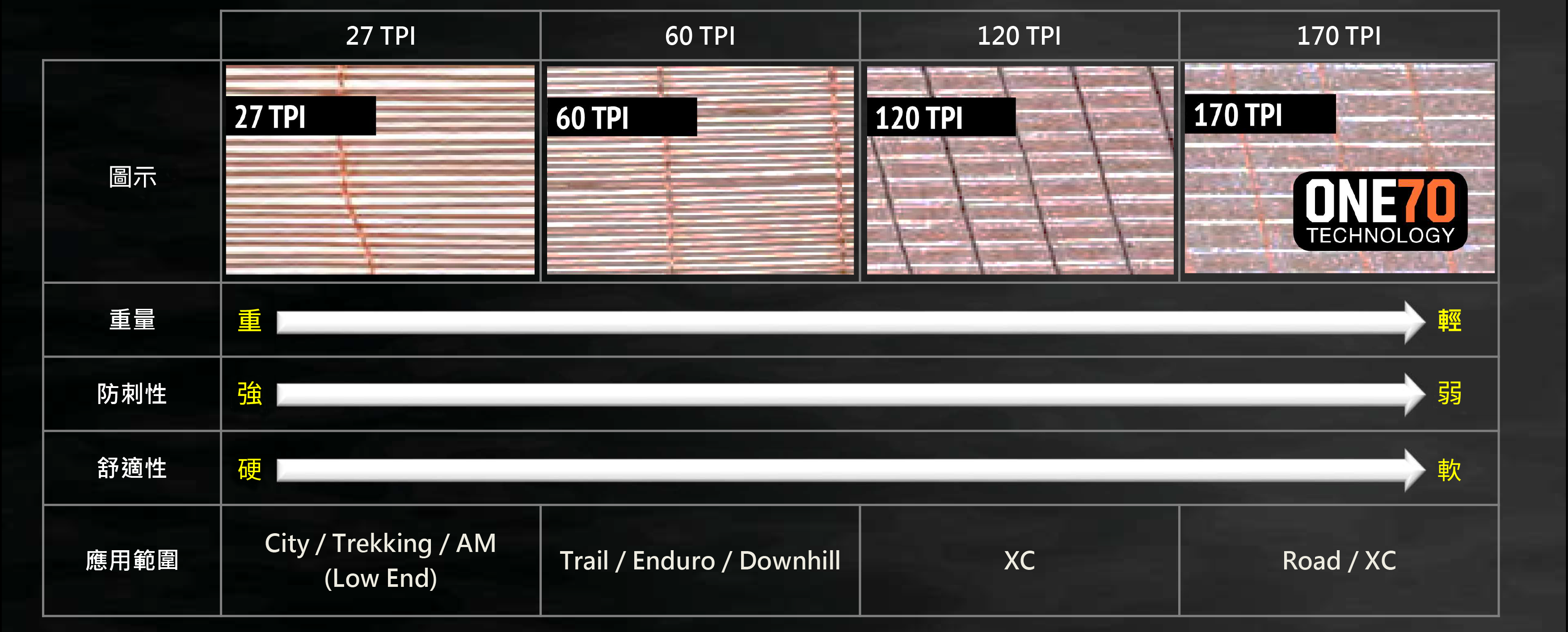 各型號的外胎除了有許多規格外,同一種規格會有不同的TPI與膠料配方。以下為各騎乘環境建議選購的TPI對照表。