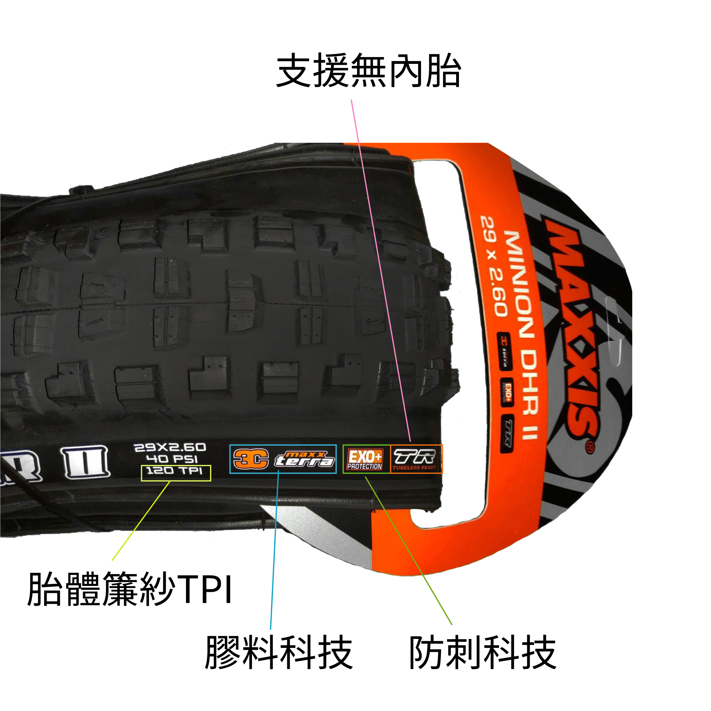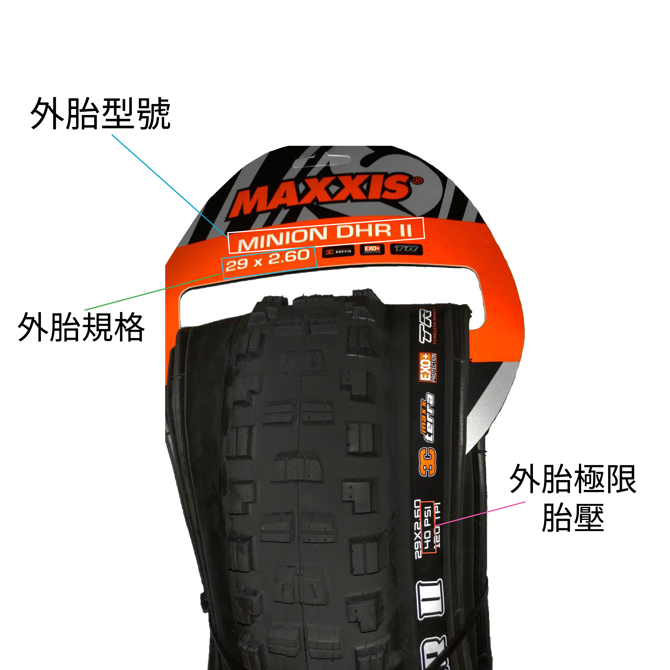 MAXXIS外胎的包裝與側邊會顯示:型號、外胎規格、TPI、膠料與防刺科技等。