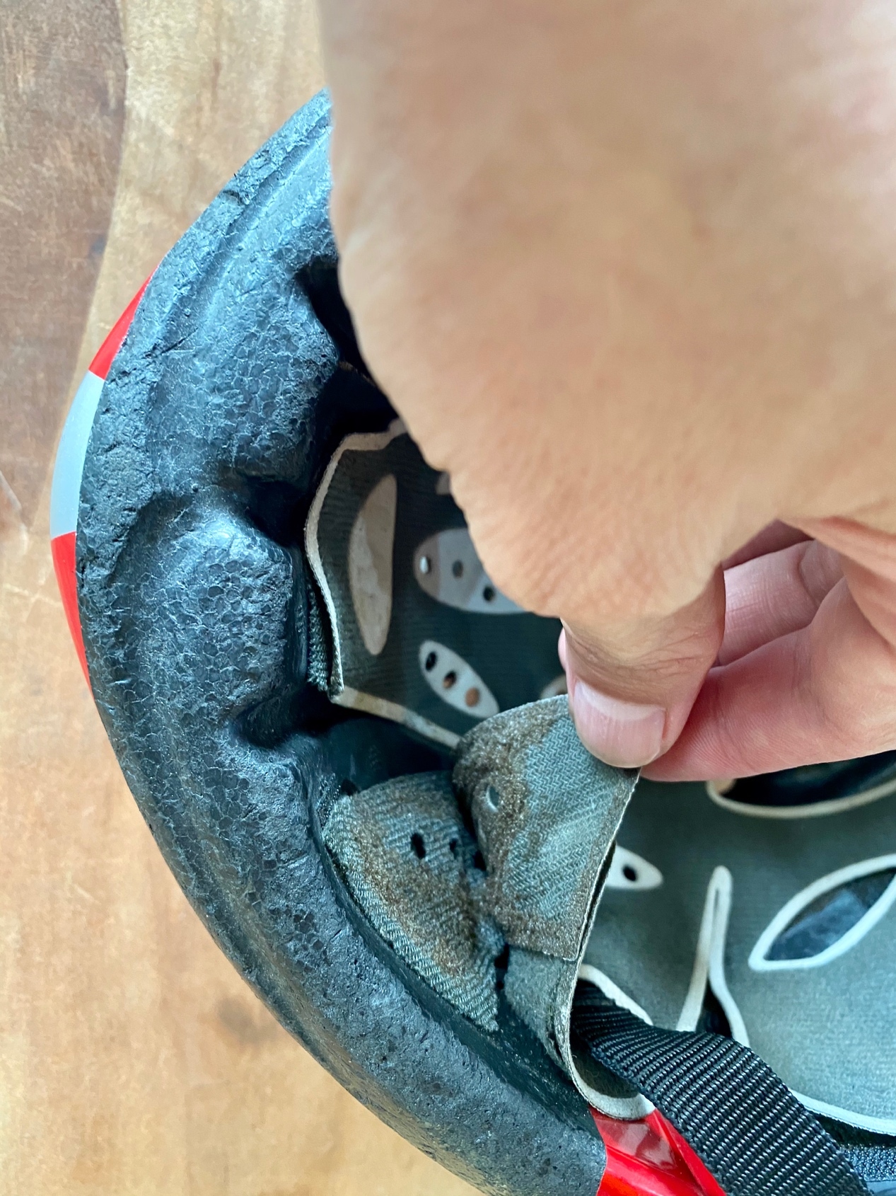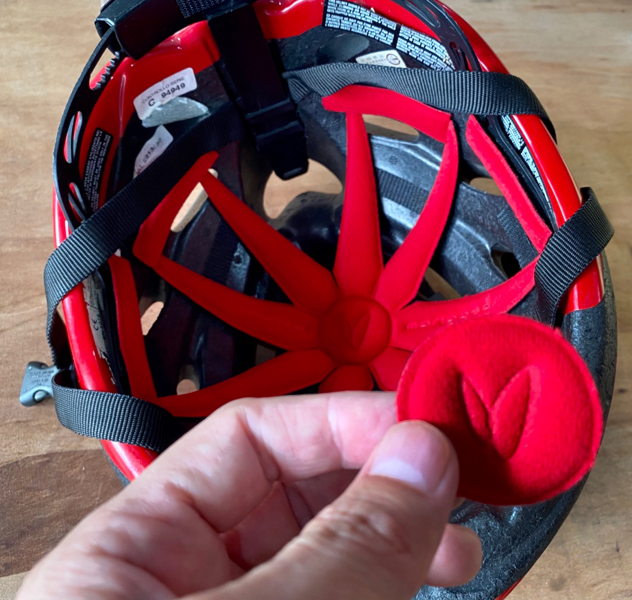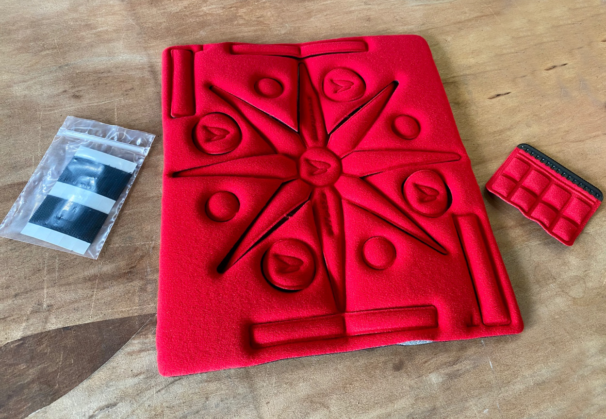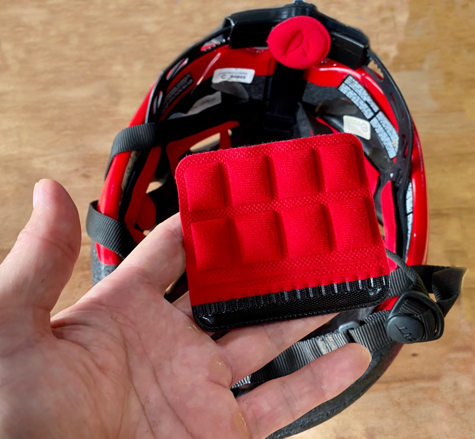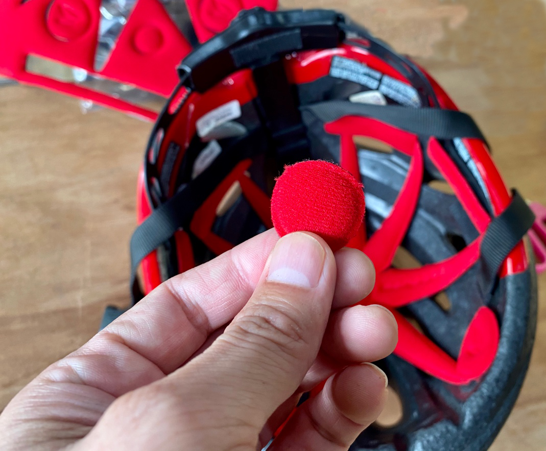 接著將長型襯墊條與圓形的襯墊塊剪下後,尋找合理位置貼上。幾乎所有原有的魔鬼氈都可以覆蓋,不用擔心會魔鬼氈刮到頭髮。