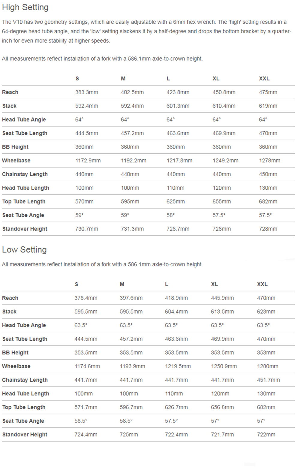 在世界下坡賽歷史中,Santa Cruz V10是贏得最多冠軍的車款。V10天生就是為競賽而生,而不僅屈身於一般的自行車公園中。由V10的下連桿驅使,運行216mm的VPP虛擬轉點行程。在踩踏出彎與直線長下坡路段,V10的性能效率絕對出乎你的預期。我們蒐集Syndicate車手的回饋,在第六代V10上新增反轉墊片讓你可以調整車架幾何,在低緩的與更低更緩的兩種角度間切換。