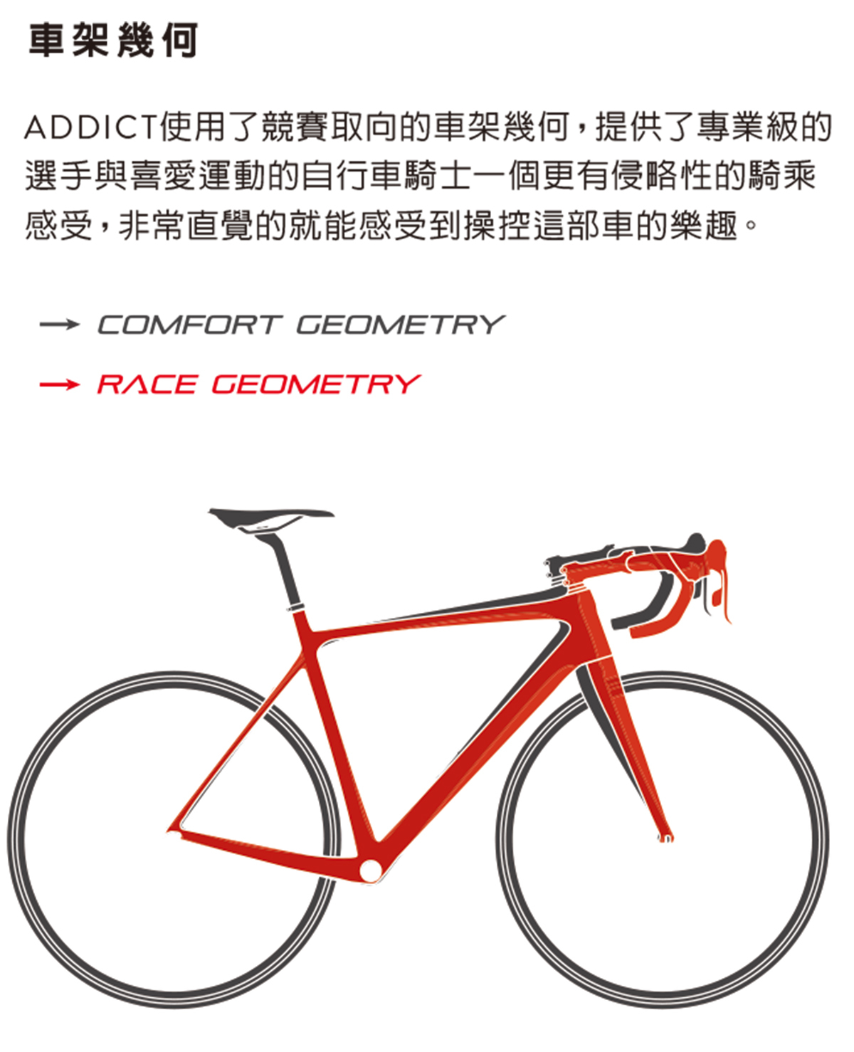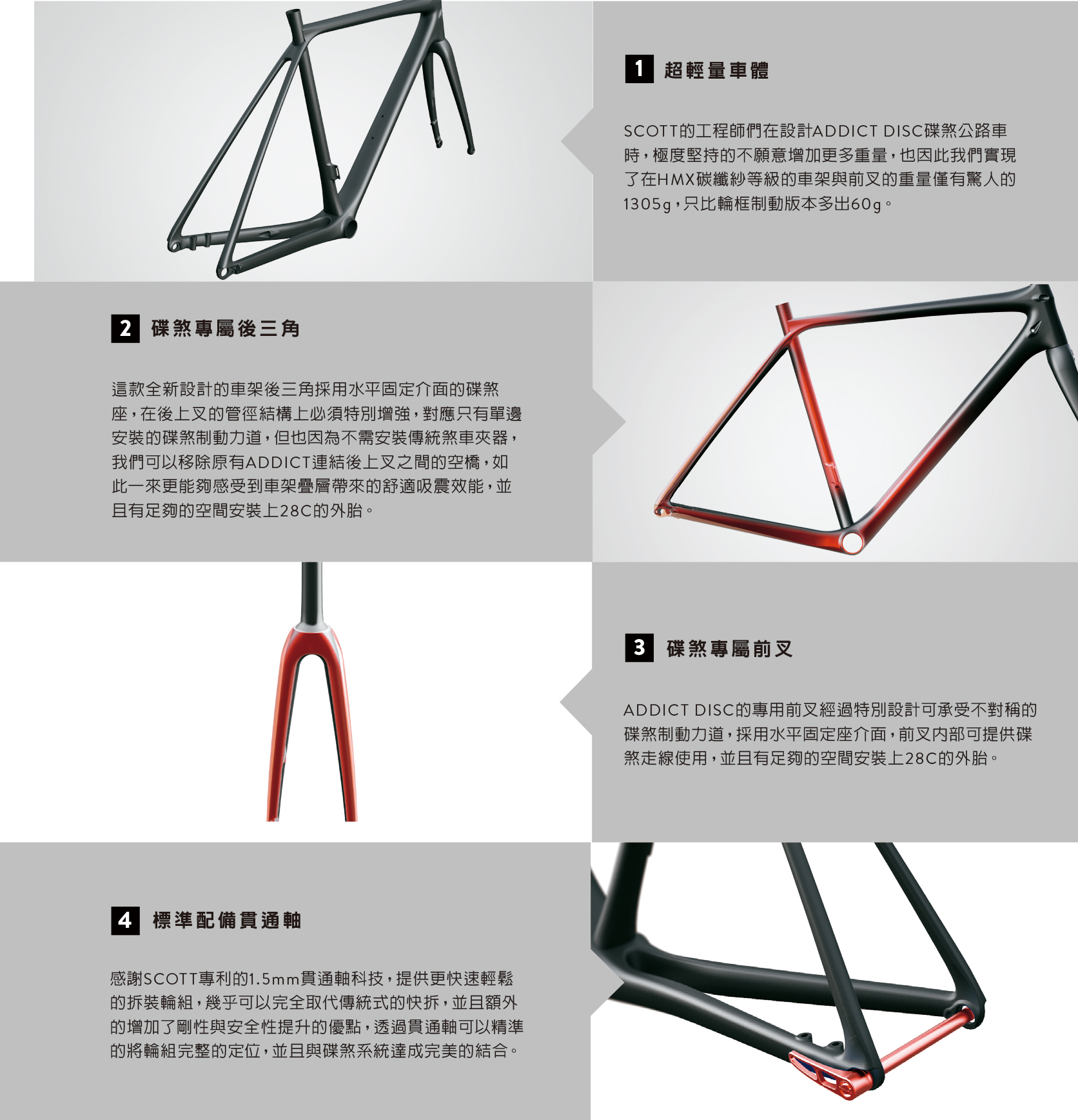 全新的ADDICT DISC的車體結構幾乎是重新設計的,在以碟煞制動的原則下,我們仍然必須保有輕量化的個性,改變的範圍包括在車架後三角與前叉上設定了專屬的平面式碟煞座,同時也增加了管件與輪胎間隙以及變更走線的方式完全符合最新的公路車碟煞動力科技。