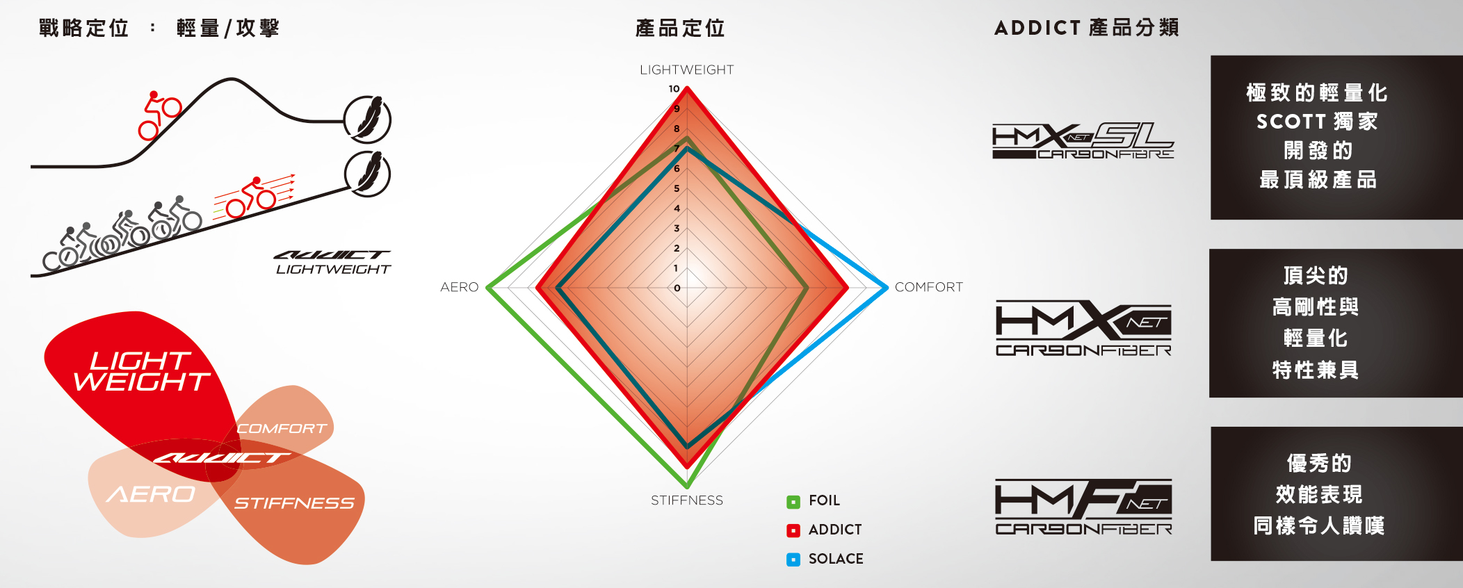碳纖維擁有種類繁多的特性,硬度和剛性就是兩種非常不同的屬性,例如非常堅硬的纖維通常較不具備韌性,而HMX-SL和HMX所使用的高級數複合型碳纖維,達到了不可思議的輕量化,卻又具有絕對的強度。如HMX-SL採用MR70、YS60以及HR40碳纖紗,其中HR40是一種很強韌的絲線,與MR70合併使用後,達成了前所未有的抗拉伸強度。為了達成既定的剛性目標值,我們在疊層中加入了YS60,選定碳纖材料後,工程師們使用特別的工具,例如以FEA軟體畫出碳纖布的疊層,應用SCOTT獨家的EVOLAP科技,可以在虛擬的狀態中模擬不同的應力,並依此調整車架的結構。