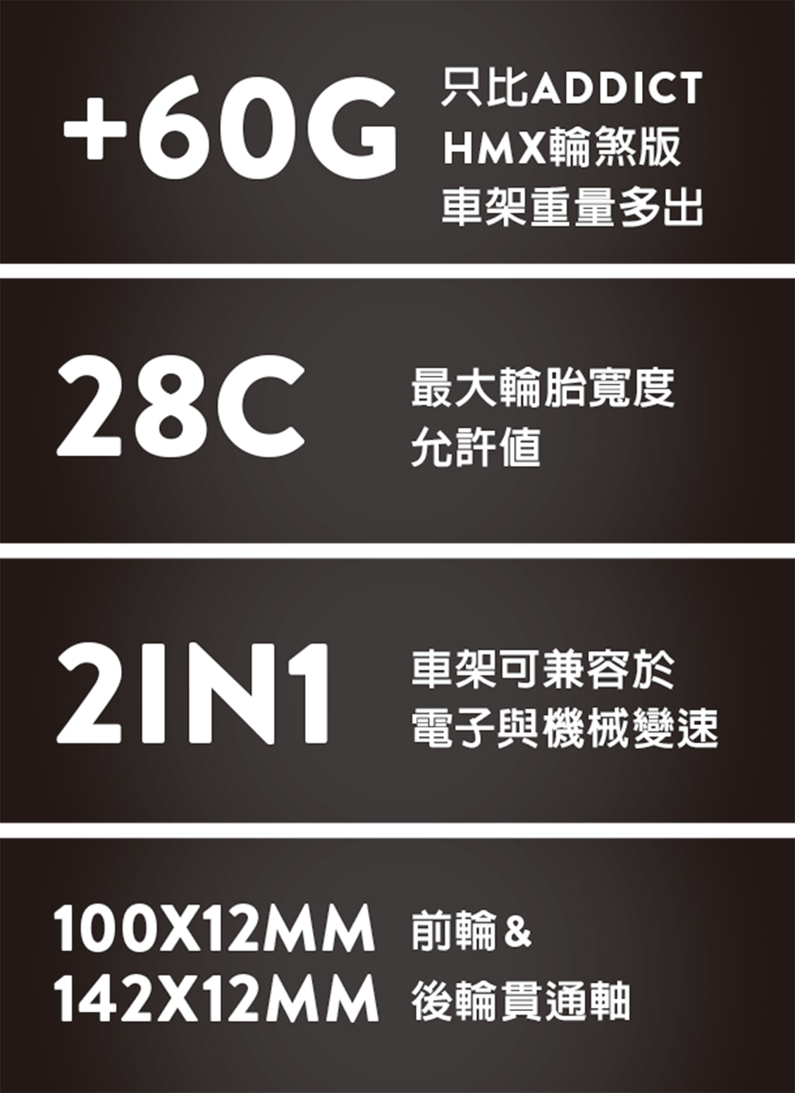 為了最佳的動力傳導效能,我們的工程部門為ADDICT 設計了當前市面上最寬的車架五通,較寬的五通設計使動力傳導可以更順暢,並且大幅增加了車體結構強度,讓踩踏的效率傳達更顯著,完全的避免任何形變可能。