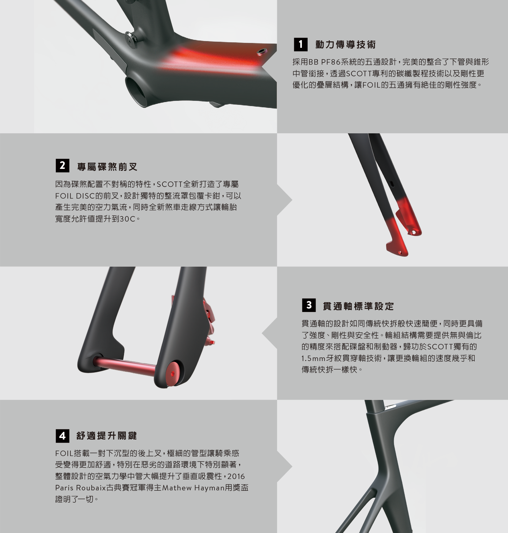 FOIL必須使用PF86壓入式BB,這種規格可容許管件在設計時於五通交會處得以放大,再施以剛性優化的疊層與SCOTT專利的IMP碳纖模內成型技術,New FOIL的BB剛性大幅提升了13%。