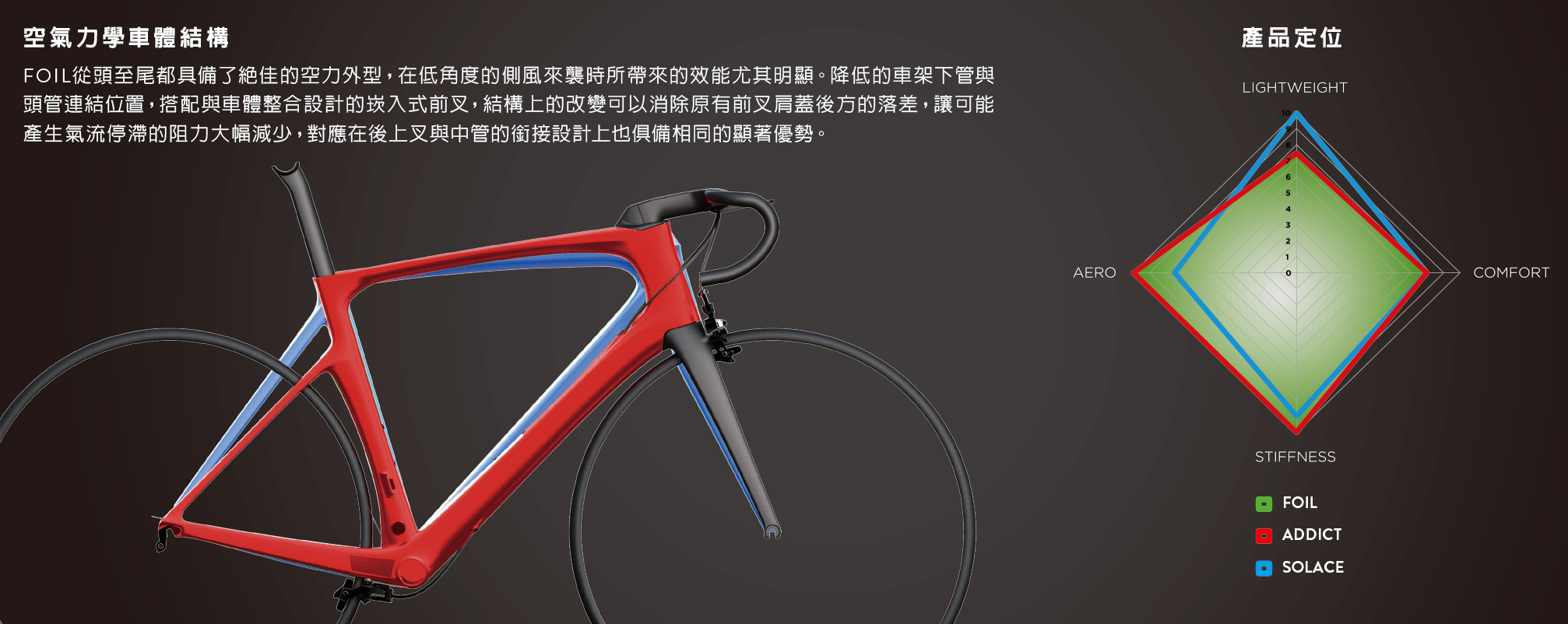 當大家都讚賞著FOIL的動力傳輸,靈敏的操控,輕量化與優異的空力表現時,職業車手們其實嚮往著更多的舒適度,以延長比賽中的耐力,我們因此調整了縱向的結構,讓舒適成為FOIL的重點特質之一。全新FOIL的後上叉與中管接合處位置比一般車種偏低,外型也明顯的扁薄,提供即使在不平路面也舒暢的騎行感受,跟前代FOIL比較下,New FOIL縱向吸震性提升86%,前叉吸震性則提升11%。