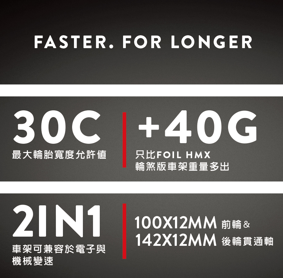 完美的錐形1 1/4 – 1 1/2車頭管規格,讓FOIL的前叉可以呈現出更強大的剛性效能,我們在設計的過程將碳纖維車體與金屬培林整合開發,最終成功的加大了培林尺寸,且不需安裝額外的套環墊圈,這項改變可以大幅提升頭管剛性達13.5%。