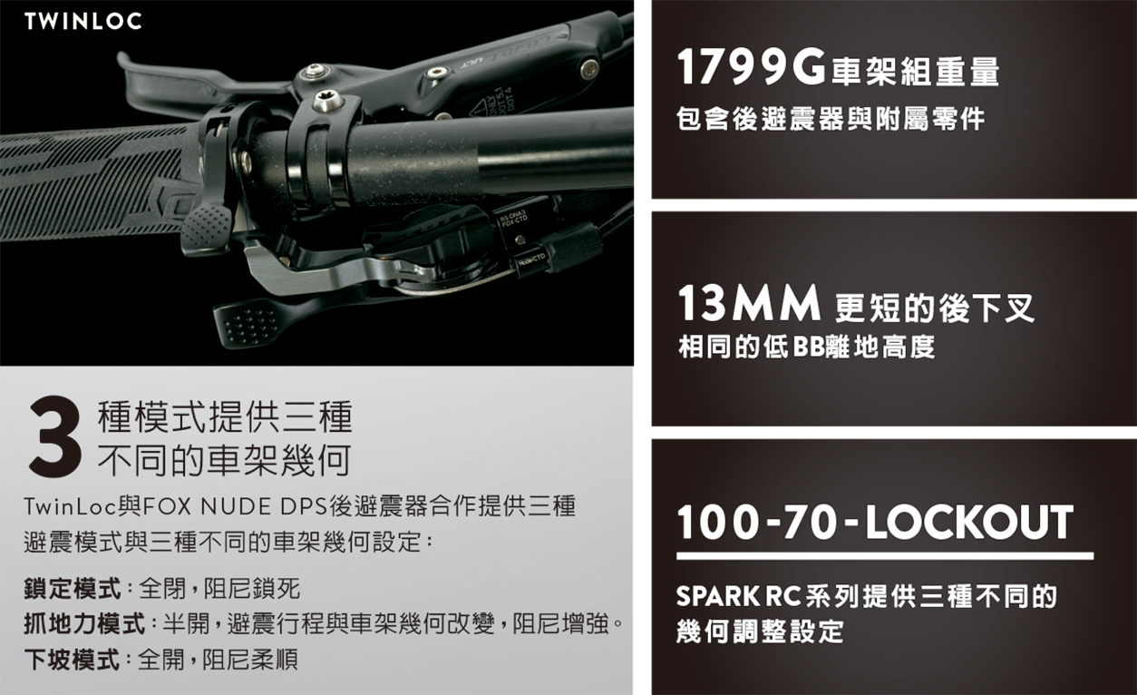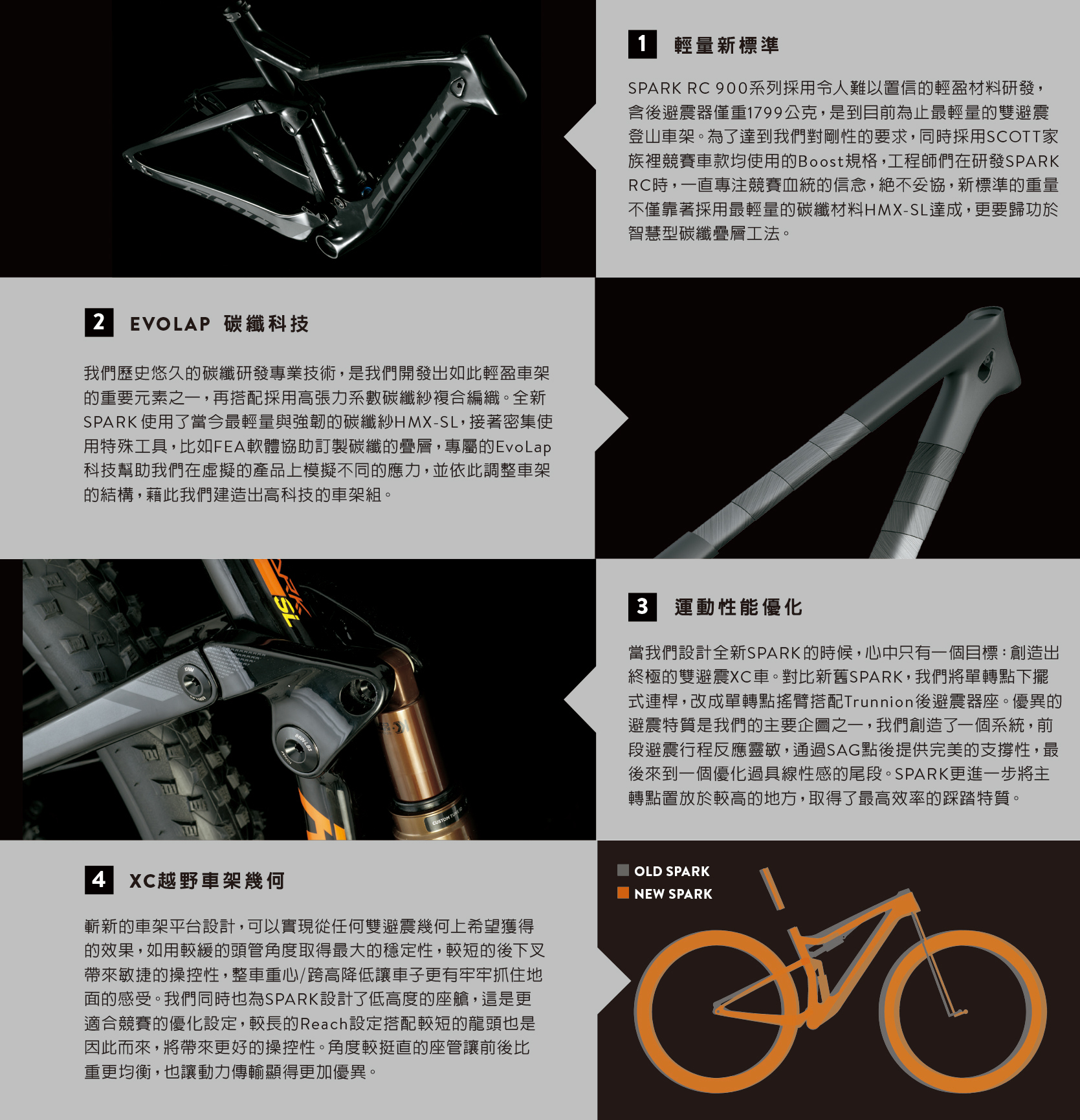 SPARK絕對是史上所有雙避震XC車系中最成功的名門,包含後壁震器低於1779公克,是市場上最輕量的雙避震車款之一。全新的車架平台設計不僅提供更輕更強的結構,更提昇了運動性能。
