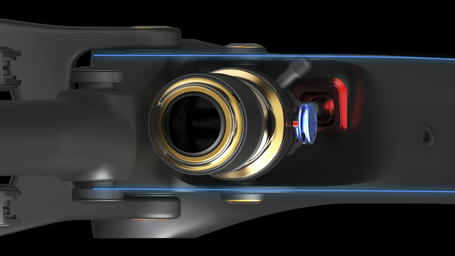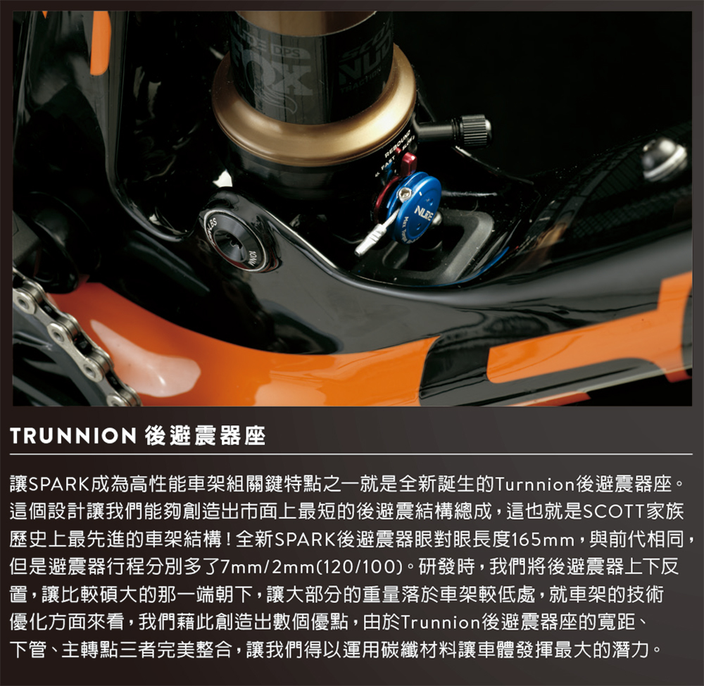 全新的SPARK在下管連結後避震器與連桿採取了非對稱式的設計,我們刻意的將後避震器位置偏移,讓車身的結構能夠順暢,讓車體的碳纖維能夠的完美的達成一個線性結構,並且在鎖死後避震器時,將可以保留左方的拉線活動空間,讓下管經過後避震器到主轉點都能保持暢通。