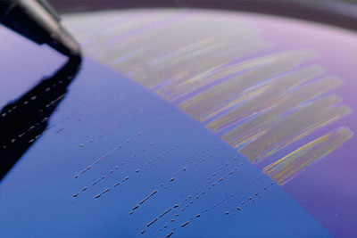 使用SR防污塗層,油性筆的油墨會在鏡片表面形成油珠,溶劑對塗層不會造成破壞,油珠可以輕易被擦拭乾淨未使用SR防污塗層墨水則會平均附著在鏡片表面上,難以清除!
