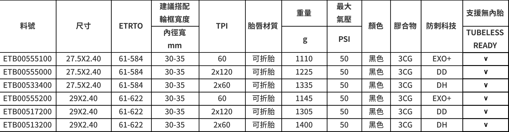 •防刺等級有EXO+, DoubleDown (2×120 TPI), 與Downhill (2×60 TPI) 可供選擇