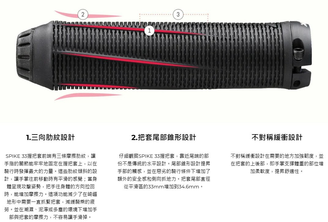 產品特點:單鎖環設計,33mm外徑,錐形把尾,Spank專屬人因工程設計的把手紋路。